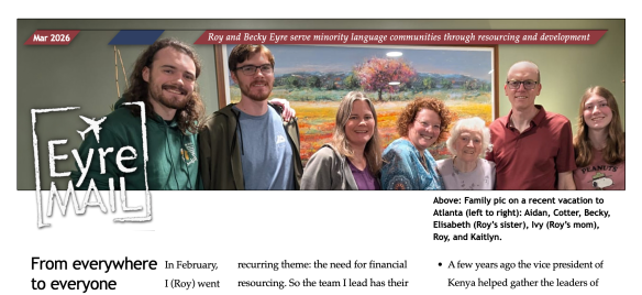 We invite you to partner with the Eyres in their Wycliffe ministry, as they long to see people transformed by encountering Jesus through God’s Word and using the languages that serve them best. You can do this through prayer and/or financial partnership. Sign up here.