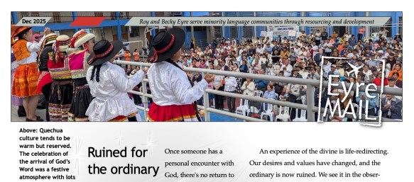 We invite you to partner with the Eyres in their Wycliffe ministry, as they long to see people transformed by encountering Jesus through God’s Word and using the languages that serve them best. You can do this through prayer and/or financial partnership.